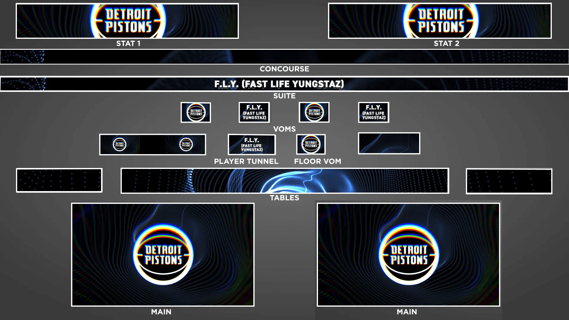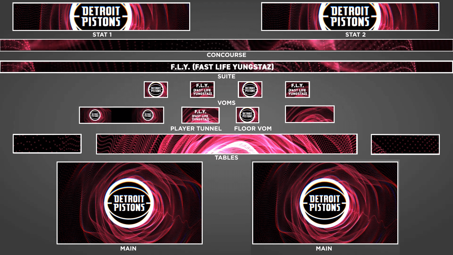 I created a 2D music visualizer that reacts to the waveform of the songs "Swag Surfin" for the Detroit Pistons Swag Cam. The animation was formatted for every screen in the arena across many different dimensions and physical sizes. I even got to go and see the animation in person!
